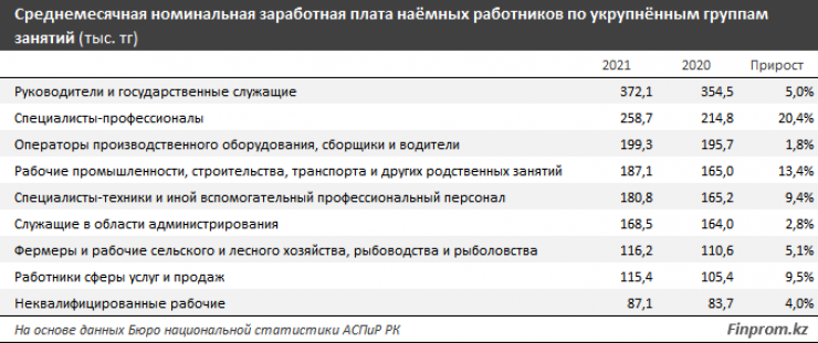 Самые высокие среднемесячные заработные платы в разбивке по укрупненным группам занятий наблюдались у руководителей и госслужащих (372,1 тысячи тенге).