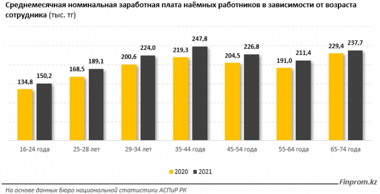 В возрастной разбивке наибольшая среднемесячная заработная плата наблюдалась у работников в возрасте от 35 до 44 лет - 247,8 тысячи тенге. Далее идут сотрудники пенсионного возраста со средним окладом 237,7 тысячи тенге.