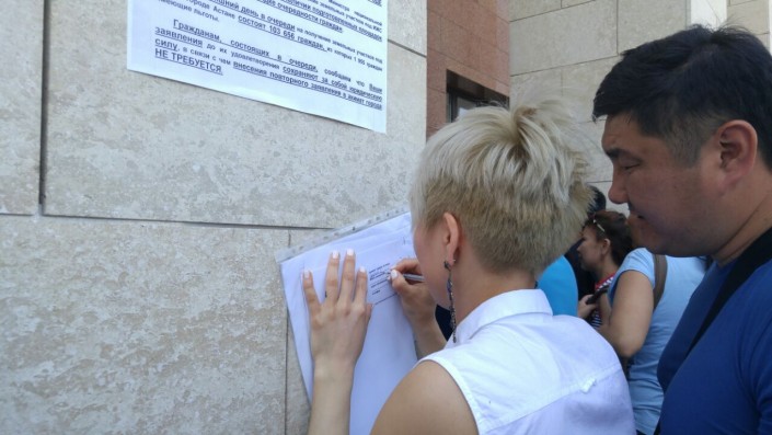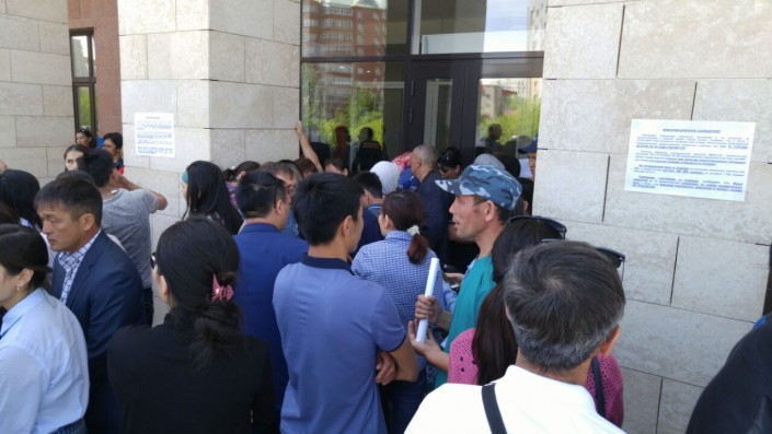 Все происходит у здания акимата района "Сарыарка". На данный момент заявления горожан не принимают, так как сейчас в акимате обеденный перерыв.