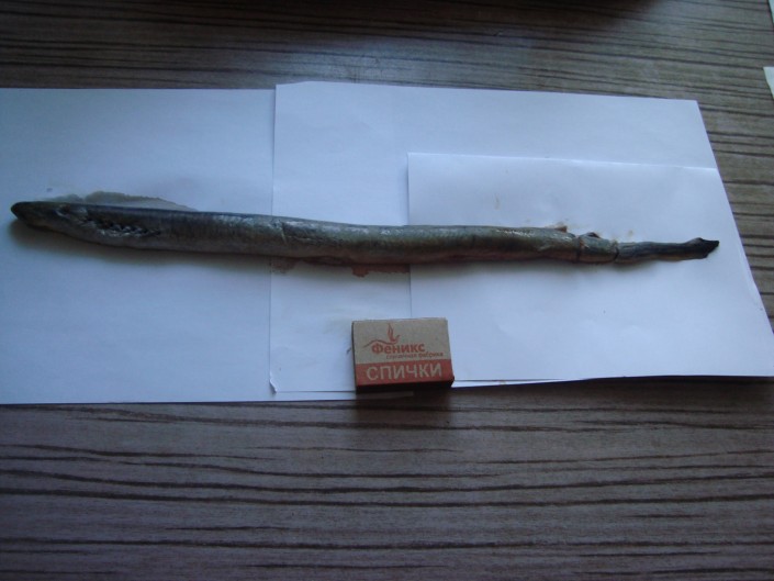 Жительница Костаная Людмила Шеферович обнаружила в купленной на Центральном рынке щуке неизвестную рыбину длиной 23 сантиметра с круглым туловищем и без чешуи. Находка была похожа на крупного червя или змею, а возле ее головы находились семь дырочек с каждой стороны и "три глаза".