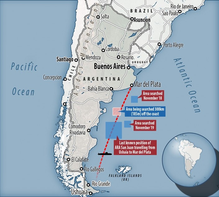 Дизель-электрическая подводная лодка ВМС Аргентины "Сан-Хуан" перестала выходить на связь 15 ноября. Субмарина совершала плановый маршрут из порта Ушуайя в город Мар-дель-Плата. В момент пропажи она находилась в 400 километрах от побережья Аргентины в Атлантическом океане.