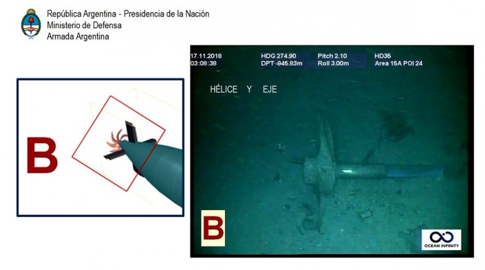 Между тем ВМС Аргентины опубликовали фото подводной лодки "Сан-Хуан". На кадрах показаны разрушенная часть корпуса и движущий винт. Также были идентифицированы другие части подводной лодки меньших размеров и форм, которые соответствуют носовой части и корме.