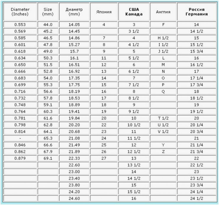 Существуют международные унифицированные размерные сетки для ювелирных украшений. Выбирая данный метод анализа, важно учитывать страну, где произведено изделие. В постсоветских странах размер кольца – диаметр окружности, в США – длина окружности, в Великобритании применяется буквенная градация. Чтобы корректно работать с таблицей, достаточно вычислить длину окружности, сопоставить результат с цифрами из соответствующего столбика.