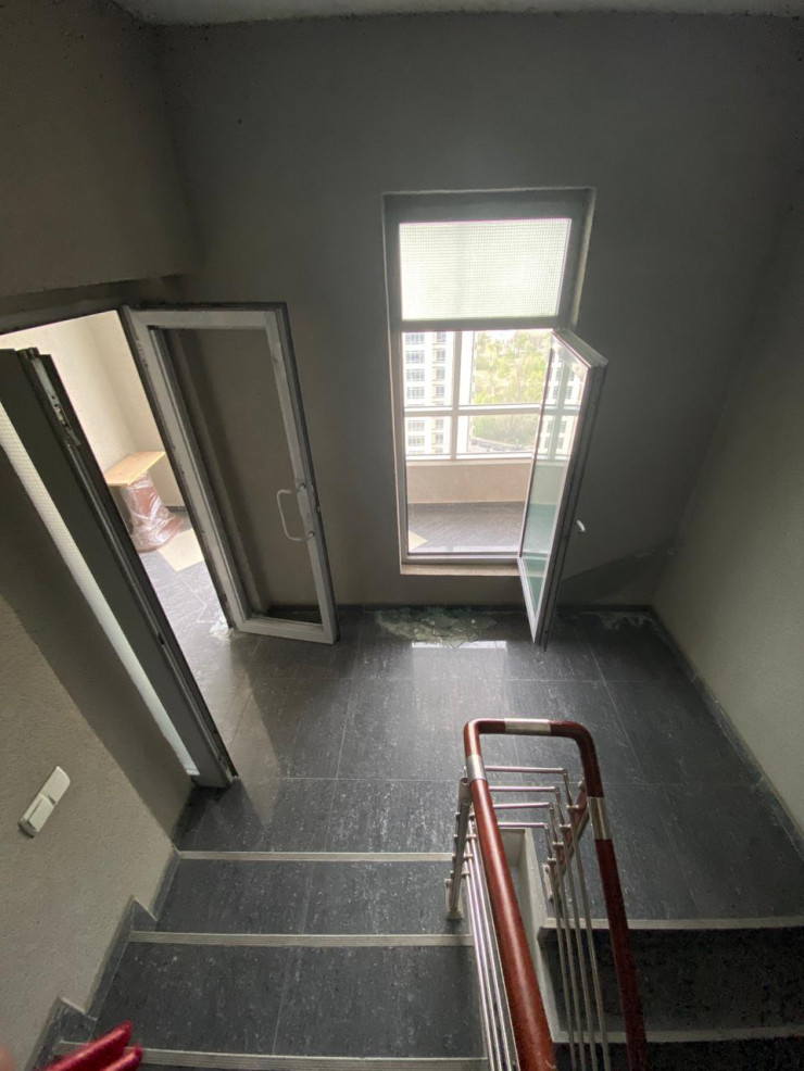 В подъезде сильно пахнет порохом. На 17-м этаже вынесена мебель, по всей видимости, из квартиры стрелка. Однако на его этаже тихо и спокойно, будто никто не живет.