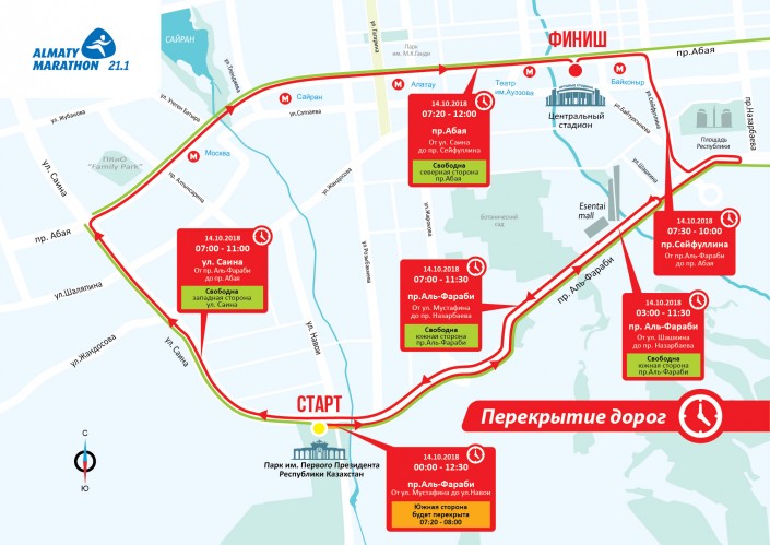 В связи с загруженностью дорог рекомендуем участникам добираться до места старта (Парк Первого Президента) на автобусе до пересечения проспекта Аль-Фараби и улицы Мустафина. Обращаем ваше внимание, что парковка возле стартового (Парк Первого Президента) и финишного городков (Центральный стадион) будет затруднена.