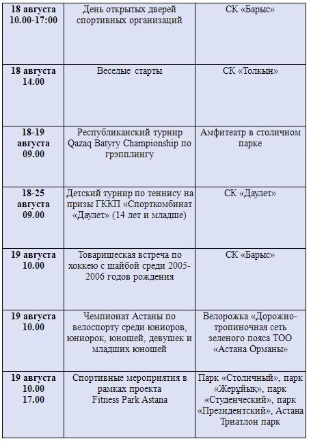 В Астане праздник будет отмечаться во всех учреждениях спорта. С 14 по 19 августа в честь празднования Дня спорта в Казахстане на всех спортивных площадках столицы одновременно будут проходить соревнования по 19 видам спорта. В программе спортивных мероприятий представлены қазак күресi, поднятие гирь, армрестлинг, асық ату, бүркітші, көкпар, тоғызкұмалақ, грэпплинг, лыжероллеры, теннис, велогонка, легкая атлетика, пауэрлифтинг, академическая гребля, бокс, киокушинкай-кан карате, таеквондо, рукопашный бой, хоккей с шайбой.