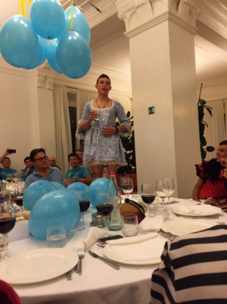 Победителя Тура де л'Авенир-2014 колумбийского гонщика Мигеля Анхеля Лопеса заставили надеть платье во время обеда в испанском Кальпе. 20-летний Лопес, которого называют Superman Lopez, произнес в странном наряде тост, подняв бокал с водой. В правом углу на фотографии запечатлен Луис Леон Санчес, также облаченный в нарядное платье.