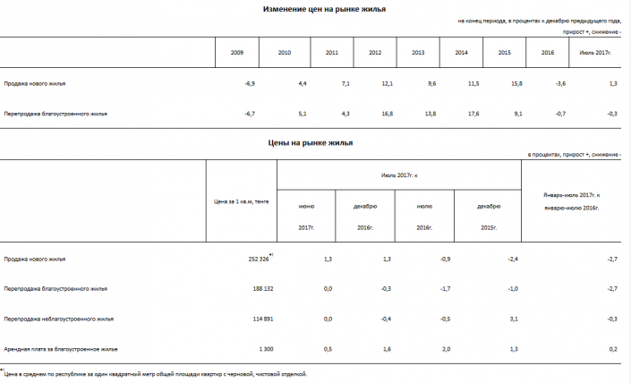 Согласно данным ведомства, средняя цена квадратного метра проданного нового жилья составила 252 326 тенге. Отмечается, что за период январь-июль 2017 года к январю-июлю 2016 года было отмечено снижение этой цены на 2,7 процента.