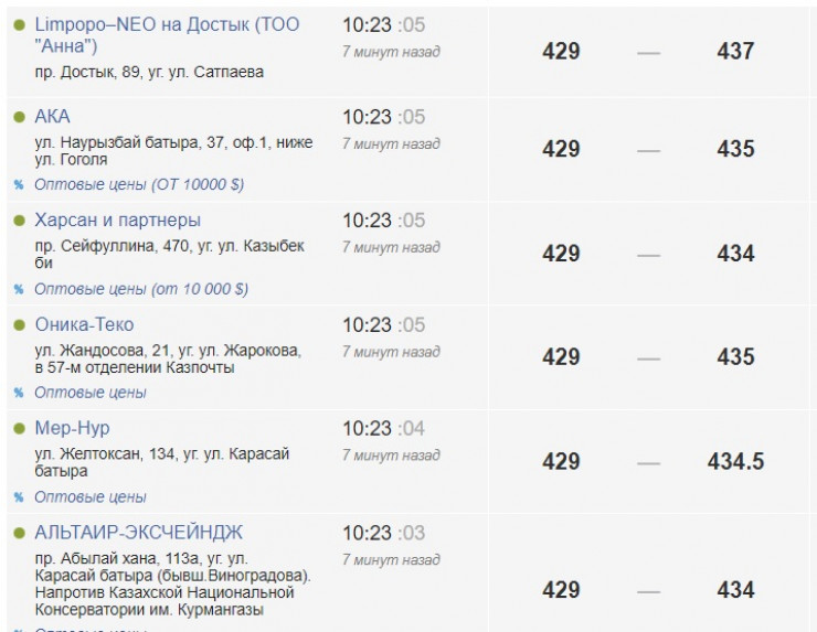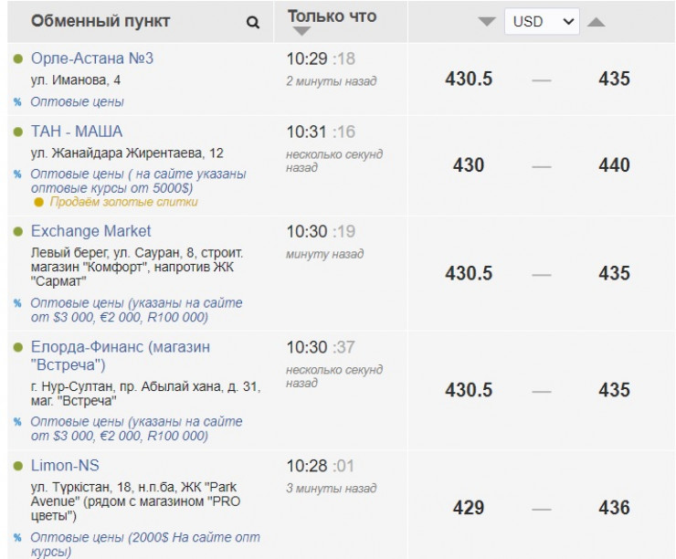 По данным Kurs.kz, обменники Алматы покупают доллары по 425-429 тенге, продают – по 432-437 тенге.