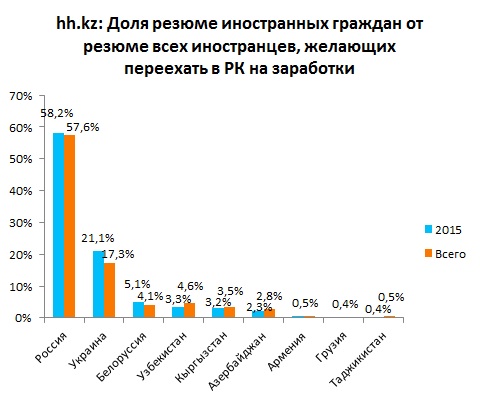 "В 2015 году 58,2 процента от всех резюме иностранцев, желающих работать в РК, было зарегистрировано от граждан России, еще 21,1 процента принадлежат гражданам Украины и 5,1 процента - Беларуси. В то же время, доля резюме россиян за весь период составила 57,6 процента, украинцев - 17,3 процента, белорусов - 4,1 процента", - отметила PR-специалист HeadHunter Казахстан Лидия Стоялова.