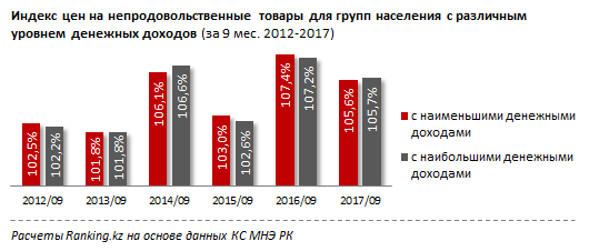 В прошлом году с января к концу сентября цены на потребительские товары для населения с наименьшими денежными доходами увеличились на 6,7 процента, а для граждан с наибольшими доходами рост был менее болезненным - на 5,8 процента. Таким образом, в прошлом году ситуация была диаметрально противоположной, и уровень инфляции для наименее обеспеченных казахстанцев был выше, чем для наиболее обеспеченных.