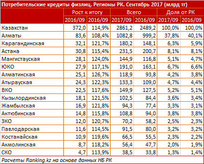 В целом за год рынок розничного потребительского кредитования вырос на 15 процентов. Объем таких кредитов, выданных физическим лицам, к концу сентября 2017 года составил 2,9 триллиона тенге. Отмечается, что к концу сентября 2016 года объем потребительских кредитов, наоборот, уменьшался на 6,5 процента.