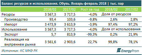 По итогам первого квартала текущего года казахстанские обувные компании произвели 145,3 тысячи пар обуви - на 16,8 процента меньше, чем в аналогичном периоде годом ранее.