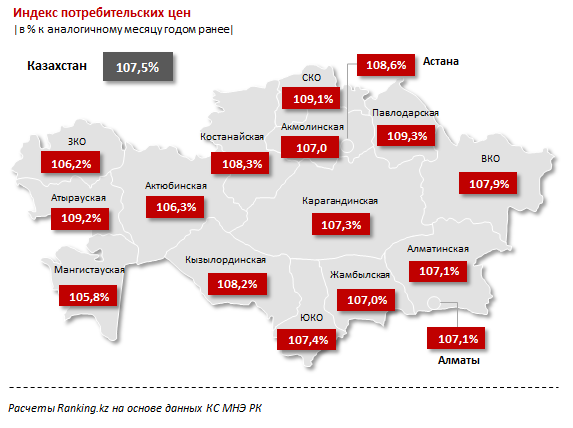 В региональном разрезе сильнее всего инфляцию ощутили жители Павлодарской, Атырауской и Северо-Казахстанской областей, где потребительские цены выросли за год более чем на 9 процентов. Самый низкий уровень инфляции отмечен в Мангистауской области - менее 6 процентов. Примечательно, что именно здесь годом ранее наблюдался самый высокий показатель инфляции - более 20 процентов.