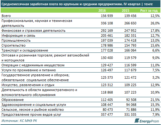 Больше всего крупный и средний бизнес готов платить специалистам в сфере научной и технической деятельности - здесь среднемесячные зарплаты по итогам 4 квартала 2016 года составляли 336,1 тысяч тенге, на 26 процентов больше, чем к концу 2015 года. Для сравнения, в целом по РК средняя заработная плата составляет 156,9 тысяч тенге в месяц. Также среди наиболее оплачиваемых отраслей - финансовая и страховая деятельность (292,2 тысяч тенге, +17,8 процента за год), и сфера информации и связи (205,5 тысяч тенге, +12,7 процента).