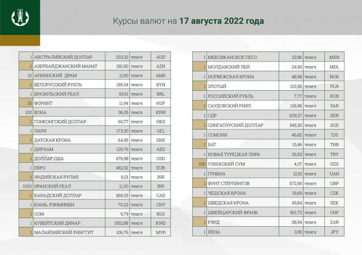 Национальный банк Казахстана установил официальные курсы доллара и рубля к тенге на 17 августа, передает корреспондент Tengrinews.kz.