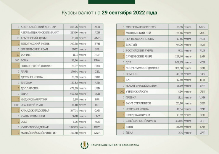 Национальный банк Казахстана установил официальные курсы доллара и рубля к тенге на 29 сентября, передает корреспондент Tengrinews.kz.