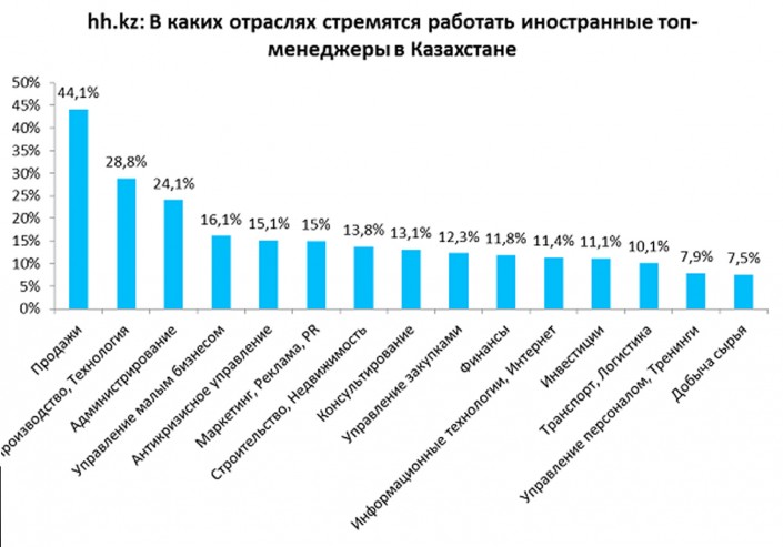 По информации Стояловой, с начала года на их сайте было размещено около четырех тысяч резюме от кандидатов, не проживающих в Казахстане, но готовых переехать в страну на заработки. "Чаще всего иностранные граждане стремятся работать на руководящих позициях. Далее по популярности среди приезжающих специалистов следующие отрасли: информационные технологии, продажи, строительство, - пояснила эксперт.  - В основном топ-менеджеры из других стран стремятся работать в сферах продаж, производства, малого бизнеса, маркетинга, строительства, консультирования и закупок".
