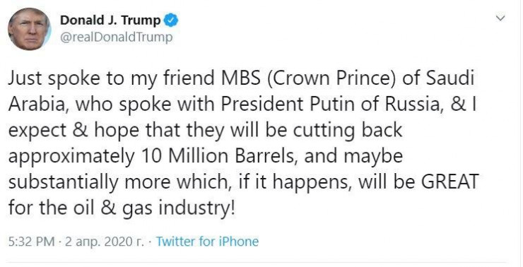 Как сообщает РИА Новости, в четверг президент США заявил, что говорил с наследным принцем Саудовской Аравии, а тот - с президентом России Владимиром Путиным о цене на нефть. При этом Дональд Трамп выразил надежду на то, что Саудовская Аравия и Россия сократят добычу на 10 миллионов баррелей.