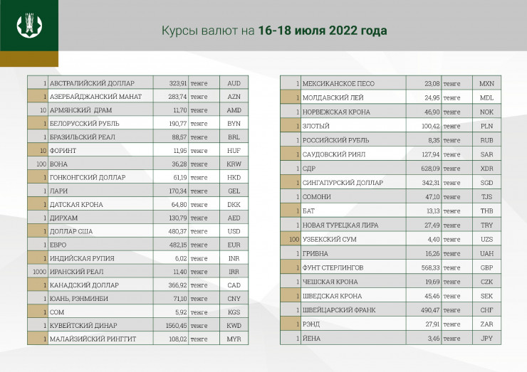 В выходные дни и понедельник официальный курс доллара будет равен 480,37 тенге. Отметим, что официальный курс американской валюты на 15 июля составляет 478,39 тенге.