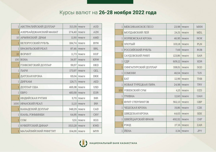 В выходные дни и понедельник официальный курс доллара будет равен 465,38 тенге. Отметим, что официальный курс американской валюты на 25 ноября составляет 465,95 тенге.