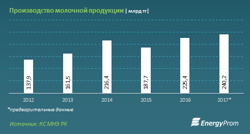 Всего производители молочной продукции выпустили товаров на 240,2 миллиардов тенге, что на 14 процентов больше, чем годом ранее.  Казахстанские производители молочки обеспечили спрос по итогам 11 месяцев прошлого года на 84,1 процента. Почти весь объем ресурсов (выпуск + импорт) потребляется внутри страны, на экспорт ушло лишь 3,3 процента. Впрочем, как отмечает агентство, объемы экспорта за год выросли сразу в полтора раза.
