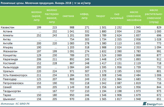 По выпуску масла лидируют компании Алматы (27,5 процента), Костанайской области (23,9 процента) и СКО (13,8 процента). Производство сырно-творожных изделий сконцентрировано в Алматинской области (28,1 процента), Восточно-Казахстанской области(13,9 процента) и Алматы (9,9 процента).