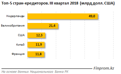 Наибольшую задолженность страна имела перед Нидерландами: 49 миллиардов долларов, почти 30,3 процента от общего объема долговых обязательств перед всеми странами-кредиторами. Великобритания - второй по величине долгов кредитор. Этой стране Казахстан должен 21,4 миллиарда долларов (13,3 процента). На третьем месте США - 12,3 миллиарда долларов (доля 7,6 процента).