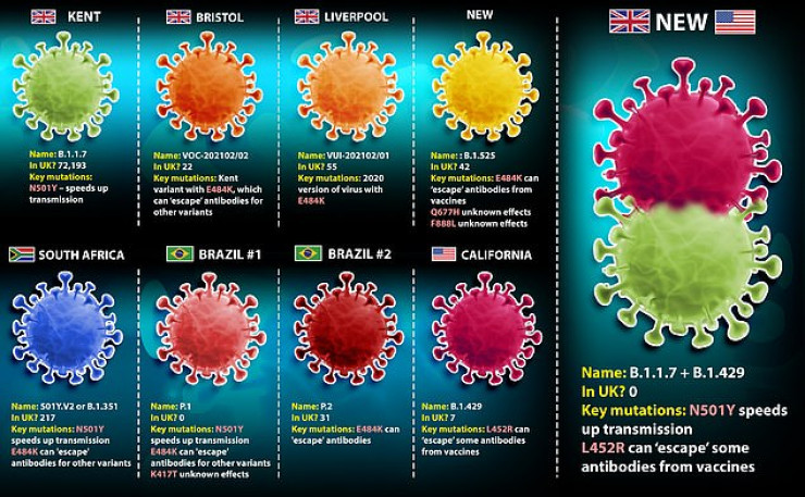 Ученые предполагают, что гибрид был образован в результате слияния двух штаммов: британского B.1.1.7 и зародившегося в США B.1.429. Пока известно лишь об одном случае заражения гибридным штаммом, однако эксперты опасаются, что инфицированных пациентов может быть больше.