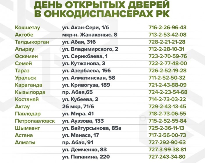"Приглашаем всех женщин Казахстана пройти бесплатное обследование у онкогинеколога, сдать мазок на онкоцитологию, а также получить квалифицированную консультацию. Акция будет проходить во всех государственных онкодиспансерах в субботу, 26 января с 9.00 до 14.00", - говорится в сообщении.