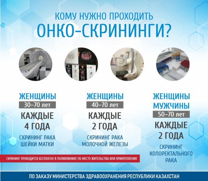 "Рак шейки матки - это единственный вид онкологии, который можно предотвратить, если регулярно обследоваться у гинеколога. Все женщины от 30 до 70 лет могут в любое время пройти бесплатный скрининг на рак шейки матки в своих поликлиниках. В специальных смотровых кабинетах у женщин берется мазок на онкоцитологию (пап-тест). Если мазок нормальный, женщина может пройти следующий скрининг через четыре года. Если результаты мазка неудовлетворительные и есть состояние предрака, то женщина направляется на дальнейшее обследование к онкогинекологу и другим специалистам. Казахстан - единственная страна в СНГ, где проводятся бесплатные скрининги для населения", - объяснила онколог.