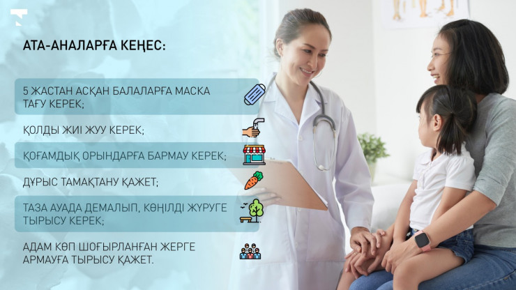 "Бұл арнайы қорқытып, үркітетін ауру емес. Алайда бір айтарымыз - қарапайым сақтану режимін ұстану керек. Ол: бес жастан үлкен балалардың маска тағуы, қолын жиі сабынмен жуып, қоғамдық орындарға бармау, дұрыс, құрамында дәрумендері бар тамақ ішу.