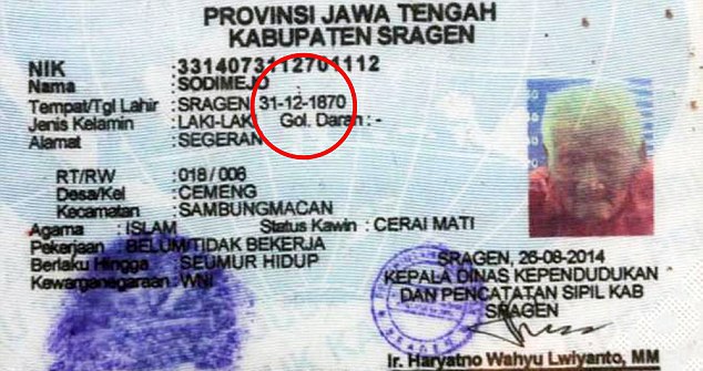Если индонезийцу действительно 145 лет, то он значительно старше обладательницы титула самого старого человека в мире - француженки Жанны Кальман, которой 122 года.