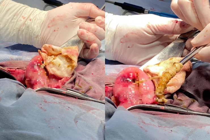 На фоне лечения кишечная непроходимость сохранялась. Во время проведения диагностической лапароскопии в брюшной полости хирурги обнаружили большое количество гноя, из-за чего было решено перейти к открытой полостной операции. Врачи обнаружили отверстие в тонкой кишке, через которое поступал гной, и хвост ленточного червя.