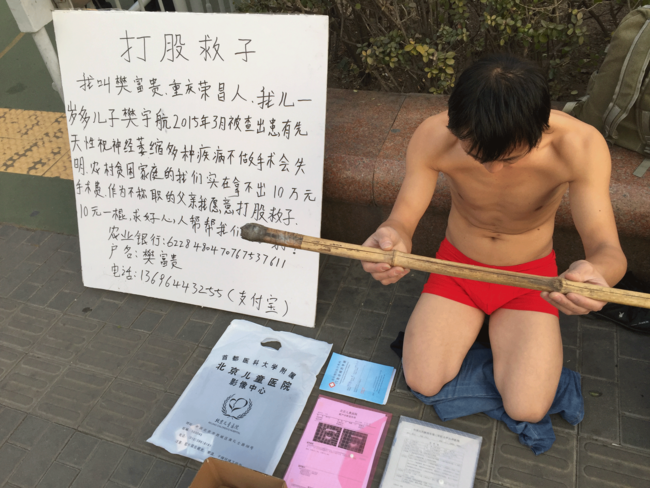 Житель Пекина Фан Фуджи встал на колени и предложил прохожим ударить его палкой всего за 10 юаней (1,5 доллара). Таким способом он хотел собрать необходимую сумму для операции его годовалого ребенка.