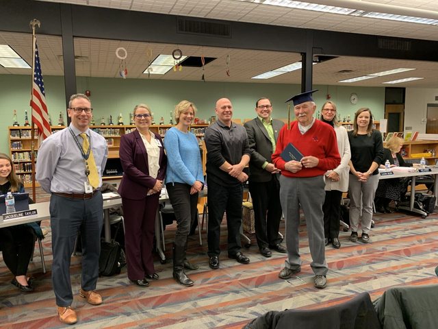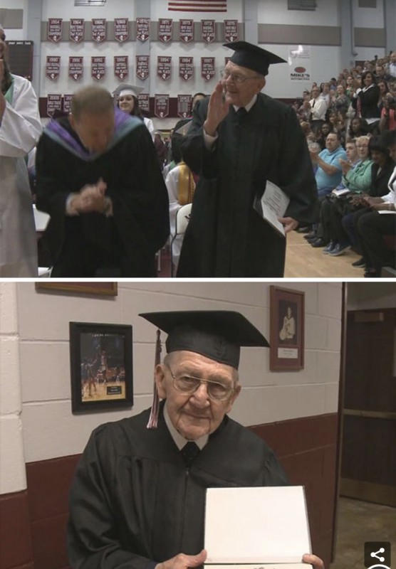 Это 98-летний ветеран Второй мировой войны. Воевать он ушел со школьной скамьи в старшем классе, поэтому не смог получить свой аттестат об окончании средней школы. И наконец ему его вручили.