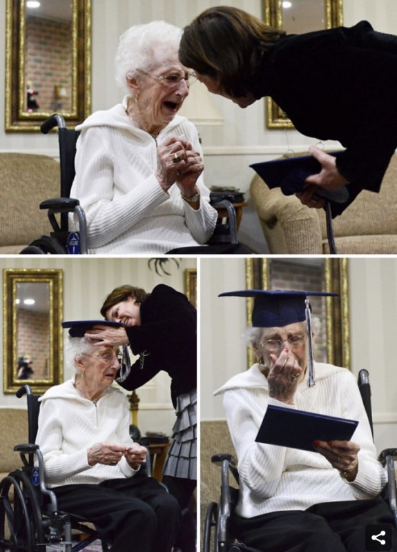 Маргарет Том Бекема, которой на фото 97 лет, должна была окончить колледж в 1936 году. Однако в 1932 году она была вынуждена покинуть его, чтобы заботиться о больной матери и младших братьях. И вот через 79 лет она получила почетный диплом об окончании учебного заведения.