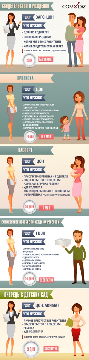 После рождения ребенка в Казахстане возникает масса вопросов по поводу документов и где их получить, начиная с получения свидетельства о рождении и заканчивая очередью в детский сад. Казахстанский портал Comode.kz подготовил памятку, которая поможет сделать забег по инстанциям короче и эффективнее.