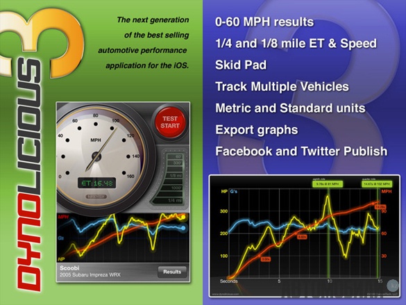 2. Dynolicious - популярное приложение, которое определяет эксплуатационные качества вашего автомобиля и его мощность. Программа измеряет: ускорение от 0 до 60; наращивание скорости; затраченное время и скорость уловителя для стандартных интервалов (60 ′, 330 ′, 1/8 миля, 1000′); боковую и тормозящую силу тяжести (текущую и максимальную); лошадиные силы. Графический интерфейс программы совсем не сложный.