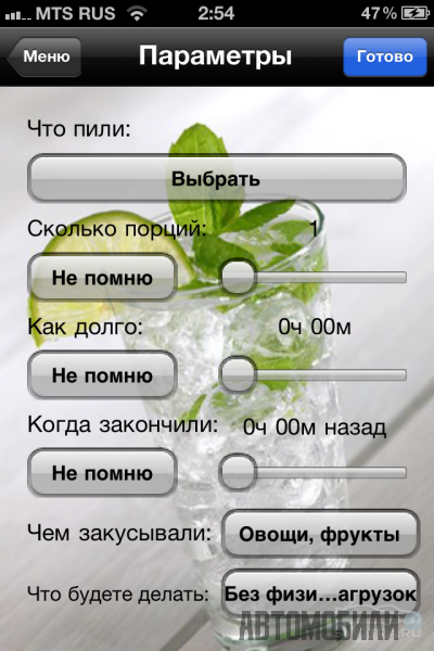 3 .iAlcohol - приложение для определения уровня содержания алкоголя в крови и вычисления перерыва в вождении. Формула расчета программы включает наиболее полное количество факторов, влияющих на результат, гарантируя точность измерения более 90 процентов. Используя последние научные исследования, приложение вычисляет влияние факторов на продолжительность фаз алкогольной интоксикации: фазы ресорбции (всасывания) и фазы элиминации алкоголя. Основные возможности: таймер окончания перерыва в вождении; история замеров; учет влияния пищи на концентрацию алкоголя; учет влияния роста, веса, пола, вида деятельности на концентрацию алкоголя; смешивание напитков; прогнозирование перерыва в вождении; смена вида деятельности после запуска таймера.