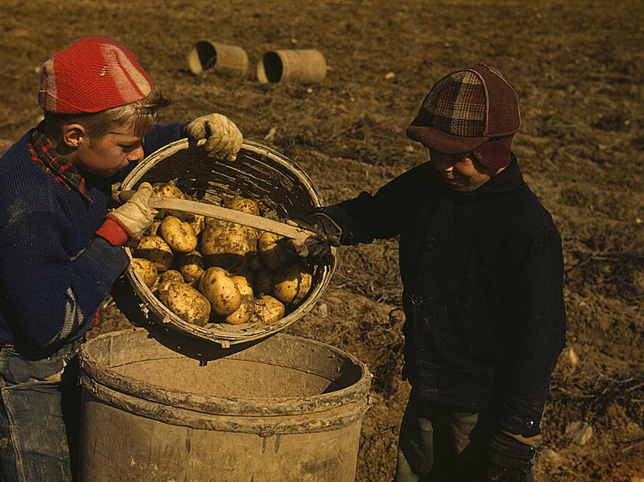 Дети убирают картофель на полях вблизи Карибу, штат Мэн. Школы не открывались до тех пор, пока урожай не будет убран. Октябрь 1940 года
