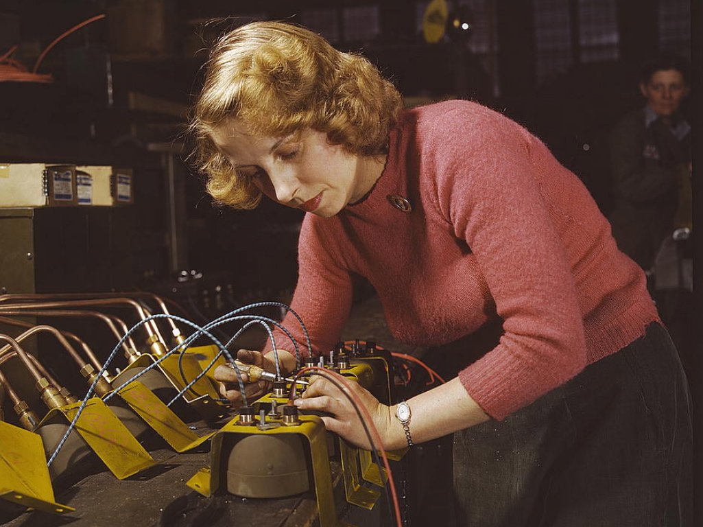 29-летняя Люсиль Мазурек, бывшая домохозяйка, чей муж был призван в армию, работает на заводе в Милуоки, штат Висконсин, февраль 1943 года. Фотограф Говард Холлем.