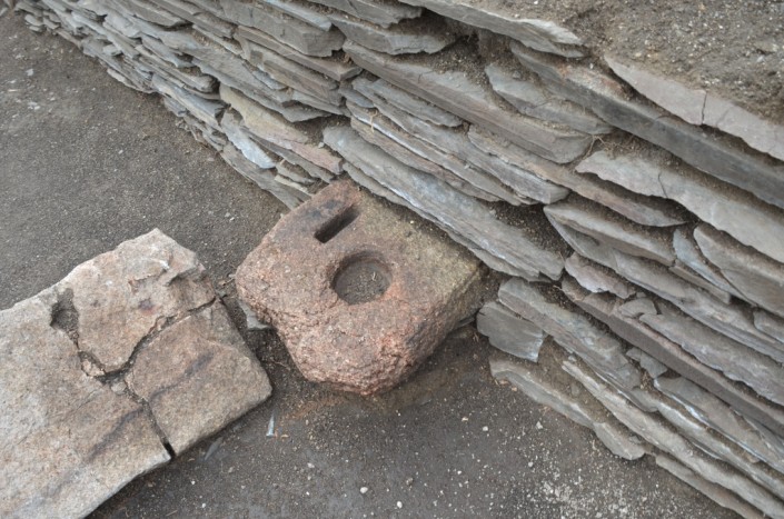 На противоположных концах фундамента арки на крупных плитах выбиты и отшлифованы лунки диаметром 15 сантиметров и глубиной 10. В одной из них сохранилась железная чашечка с остатками древесины, выполнявшая функцию подпятника - приспособления для опоры оси вертикального вала. С противоположной стороны угол плиты сточен - очевидно, от постоянной работы ворот.