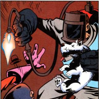 Первое место списка самых нелепых супергероев занимает "Сварщик собак". Он является членом тайной команды борцов со злом, которая использует "авангардные" методы. Злодеев "Сварщик собак" наказывает, как и следует из его прозвища, приваривая животных к их лицам.