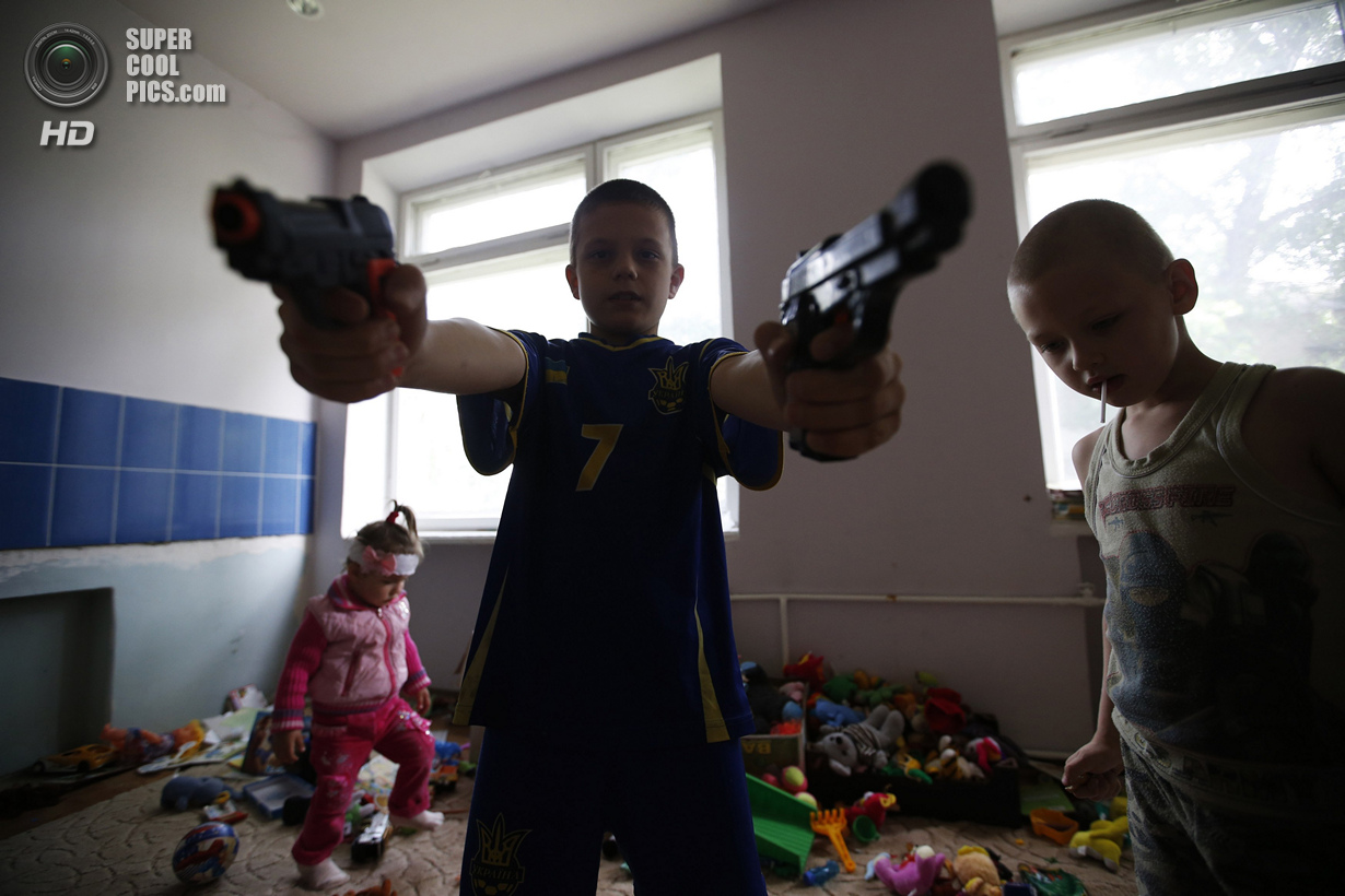 Украина. Иловайск, Донецкая область. 3 июня. Дети играют в детской комнате во временном убежище для беженцев из Славянска. (REUTERS/Maxim Zmeyev)