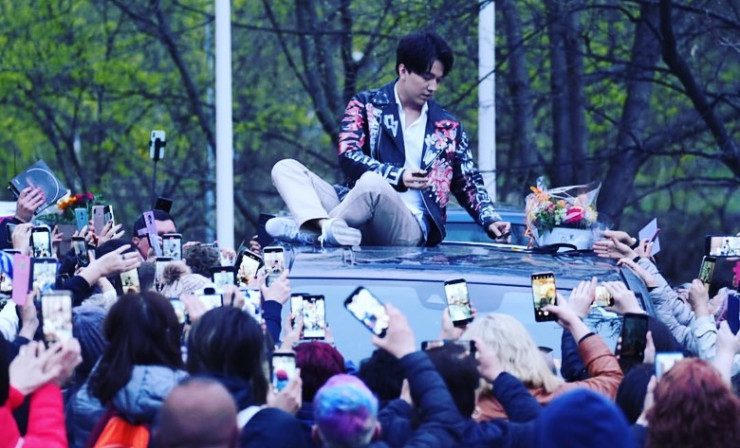 Встречающих было так много, что Димашу пришлось забраться на крышу автомобиля, сидя на которой он раздавал автографы и общался с поклонниками.