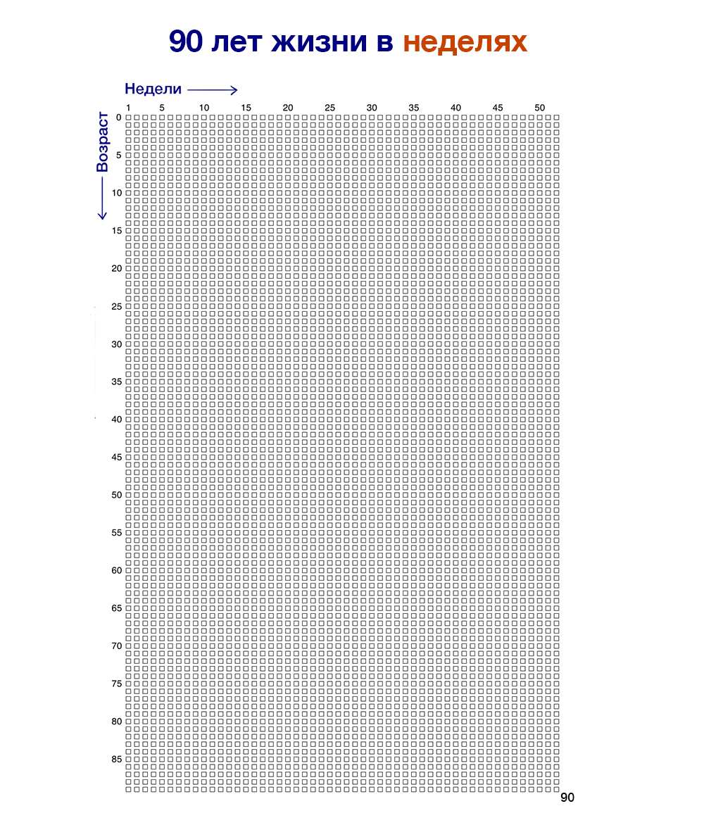 Получается полная карта всей вашей жизни размером с лист А4, которая дает наглядное представление о конечности вашей жизни и поможет ценить каждую ее неделю. Вы, вероятно, хотите спросить, где же на этом календаре дни недели, числа и месяцы?