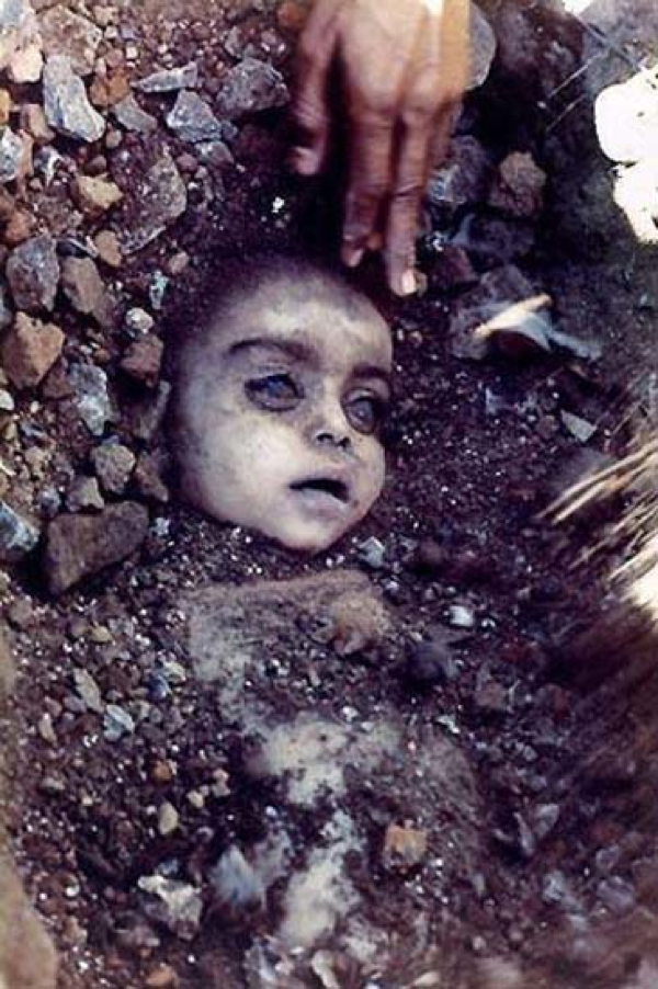 Это произошло в Индии 3 декабря 1984 года. В густонаселенном городе Бхопал случилась техногенная катастрофа - на заводе пестицидов произошел выброс в атмосферу смертельно опасных веществ, в результате чего погибли около 18 тысяч человек. Индийский журналист Пабло Бартоломеу подошел к мужчине, который хоронил ребенка, и сделал эту фотографию. Какие-то дополнительные комментарии здесь излишни.