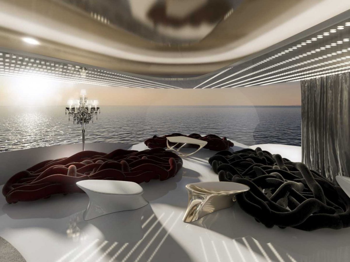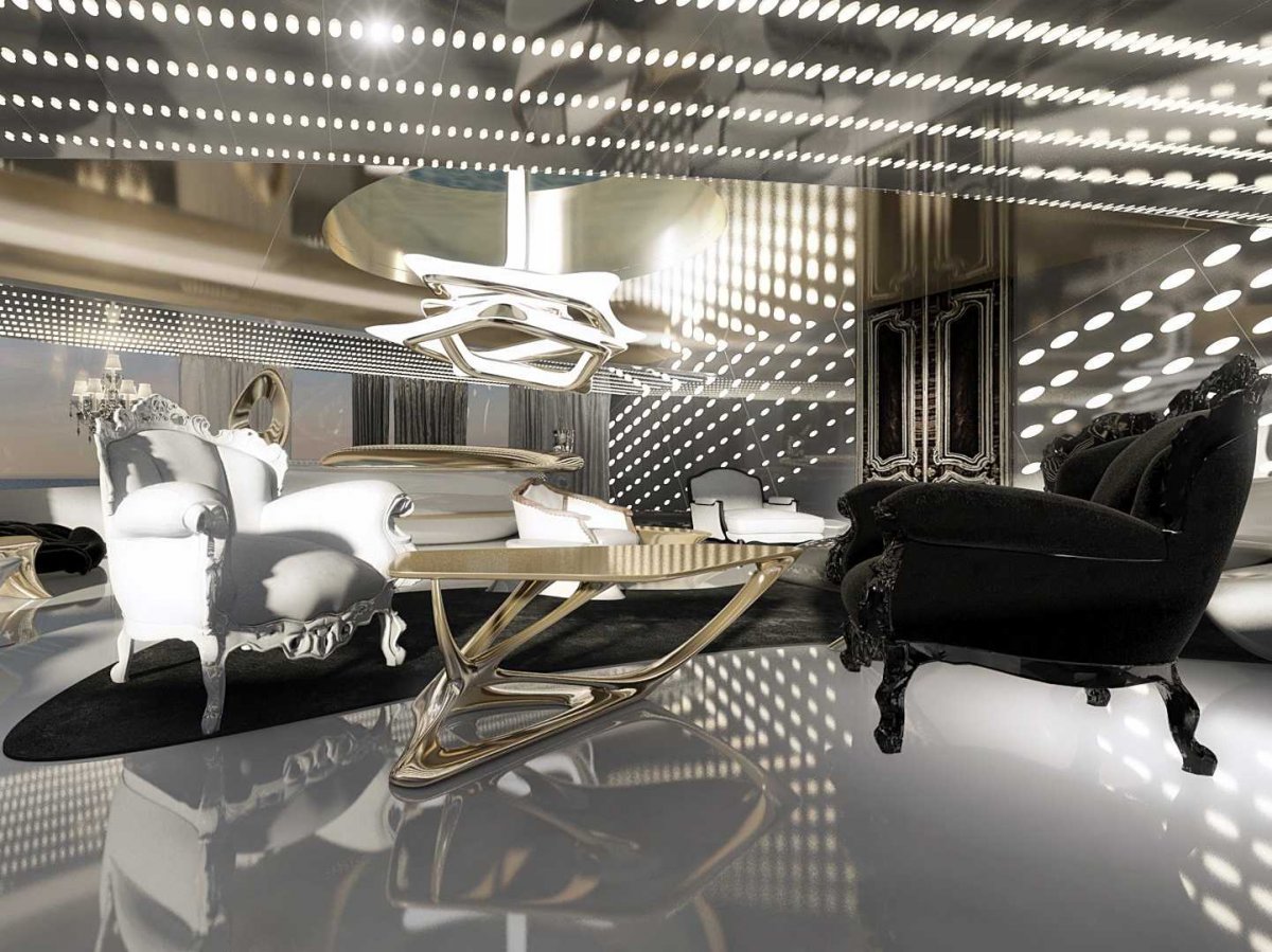 Внутри яхта оформлена экстравагантными деталями. Главный салон выглядит грандиозно.
