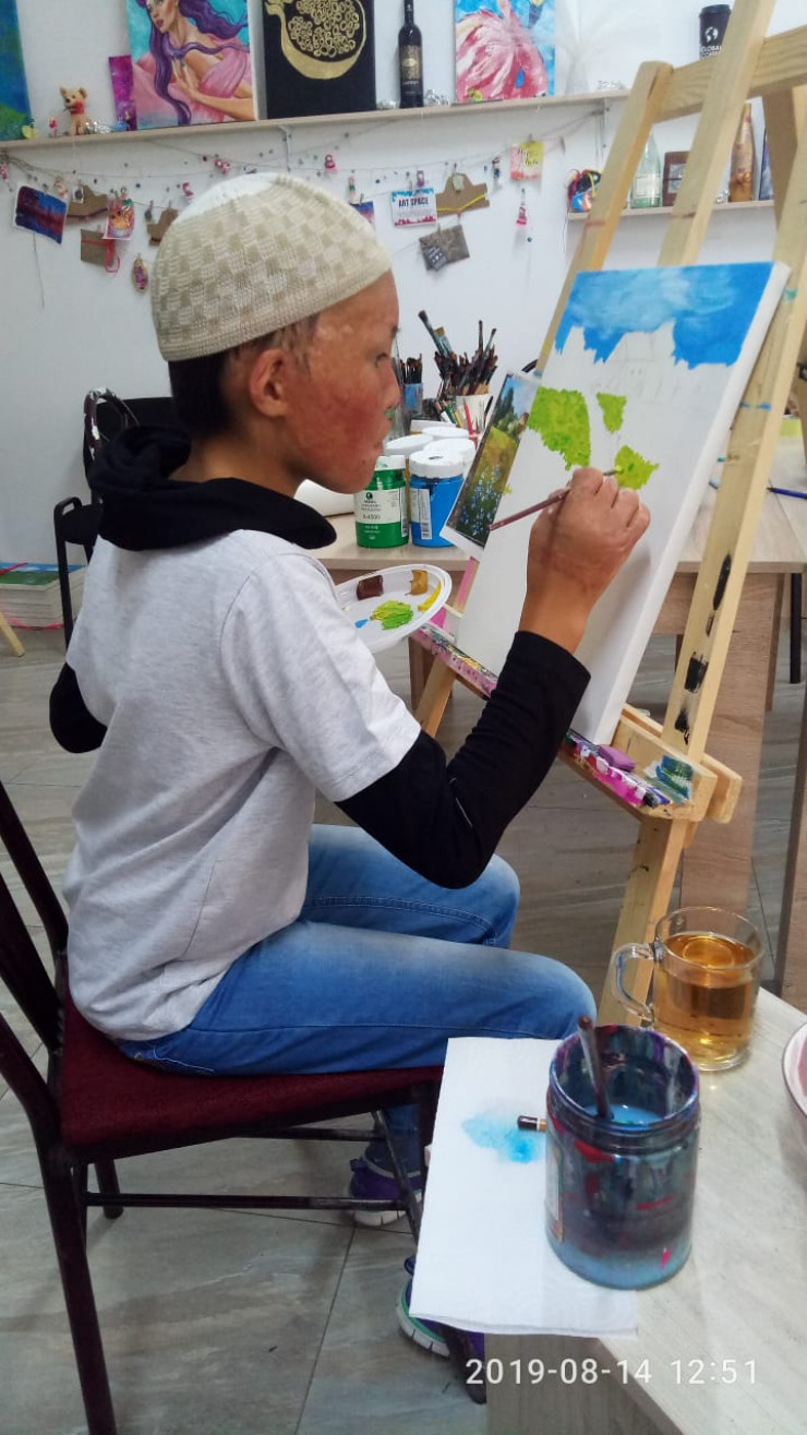 "Видя, как мой ребенок талантливо рисует, волонтеры предложили продавать его картины. Мы никогда об этом не задумывались, но у сына загорелись глаза от той мысли, что он сам сможет зарабатывать на свою операцию. Он сказал: "Буду копить на новое лицо". Учитывая расходы на материалы, предложили за работу 10 тысяч тенге. У нас уже забрали два пейзажа, готовы еще две картины.